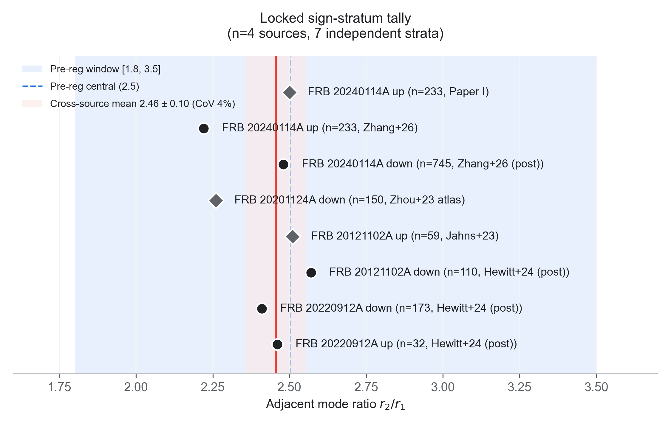 Stepping back: across four distinct repeating fast radio burst sources, observed by FAST and the Allen Telescope Array and Effelsberg, reduced by frbgui and our own pipeline and the FAST FRB Key Science Project's TransientX, every sign-stratum that meets the pre-registered N ≥ 30 gate produces a ratio inside [1.8, 3.5] with cross-source scatter 3.8%, against a framework locked before the validating data was inspected, surviving a Monte Carlo unimodal null at p ≤ 5 × 10⁻⁴.