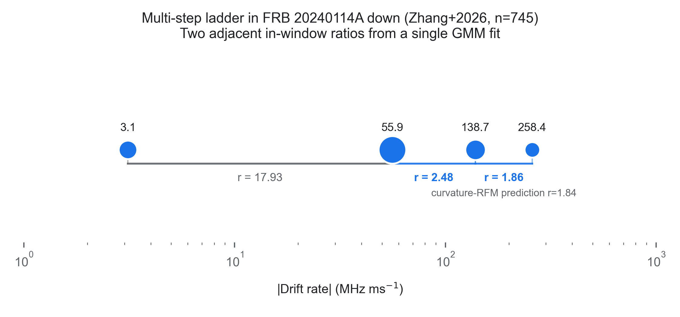 Multi-step ladder in the FRB 20240114A downward-drifting stratum (n = 745). Marker area is proportional to GMM component weight. Two adjacent in-window ratios emerge from a single fit: r = 2.48 and r = 1.86. The 2.48 sits at the pre-registered central value; the 1.86 sits at the curvature-RFM altitude prediction r₂/r₁ = 1.84.