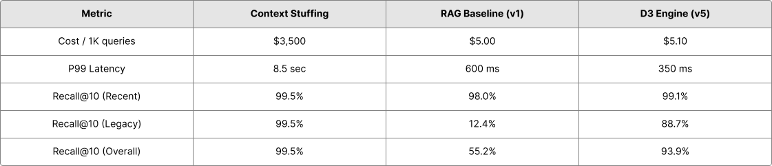 - Legacy Recall: D3 achieves 88.7% recall on code older than 6 months, a 7× improvement over baseline RAG.