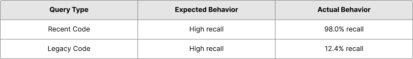 For recent code, the system performed excellently. For legacy code, it failed catastrophically. Nearly 88% of relevant historical documents were never surfaced to the model. This wasn't a bug in our implementation; this is how RAG systems are designed to work.