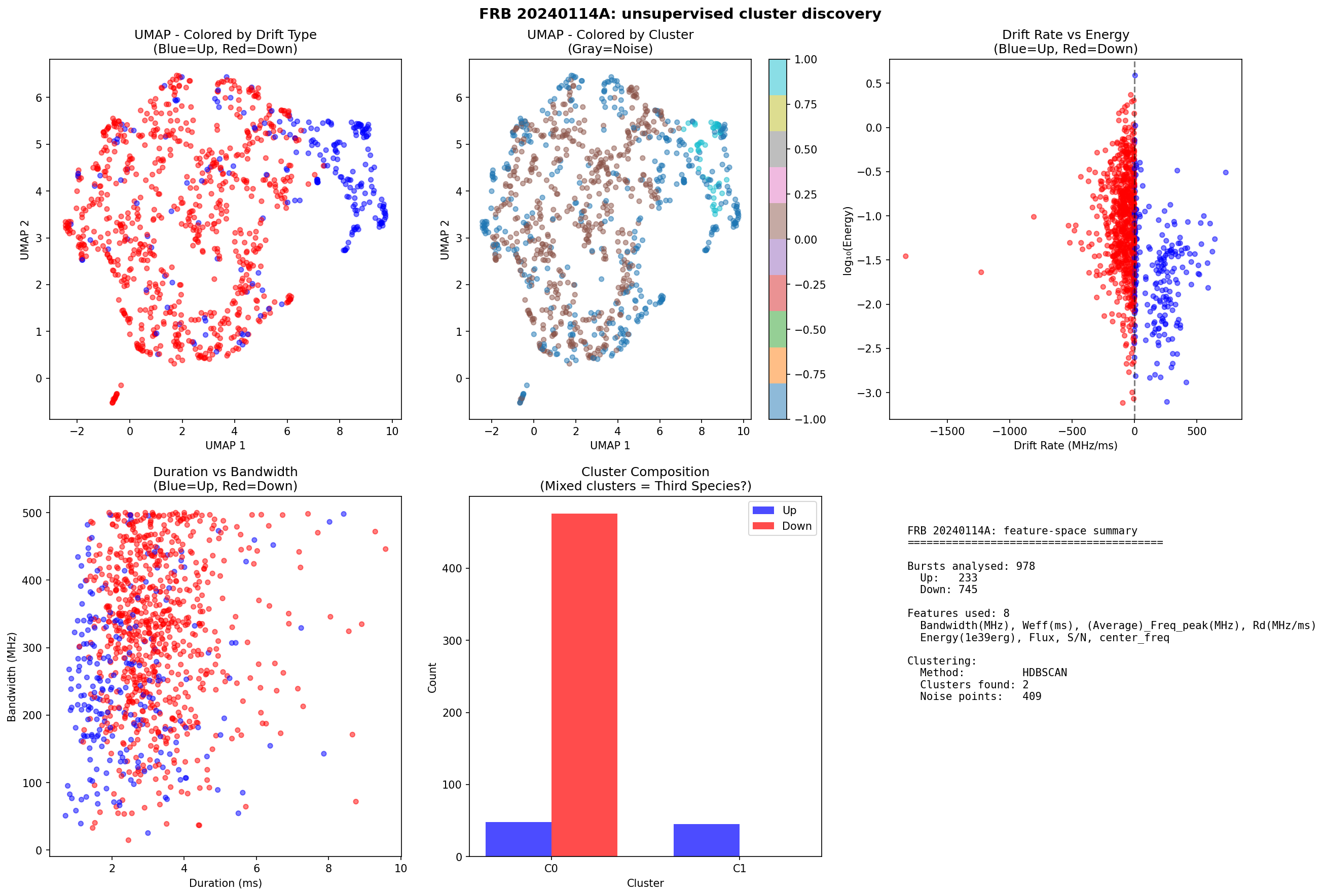 UMAP dimensionality reduction of 978 burst clusters. Left: coloured by drift direction (blue = upward, red = downward). Right: coloured by HDBSCAN cluster assignment. Cluster C1 forms a distinct island of exclusively upward-drifting burst clusters.