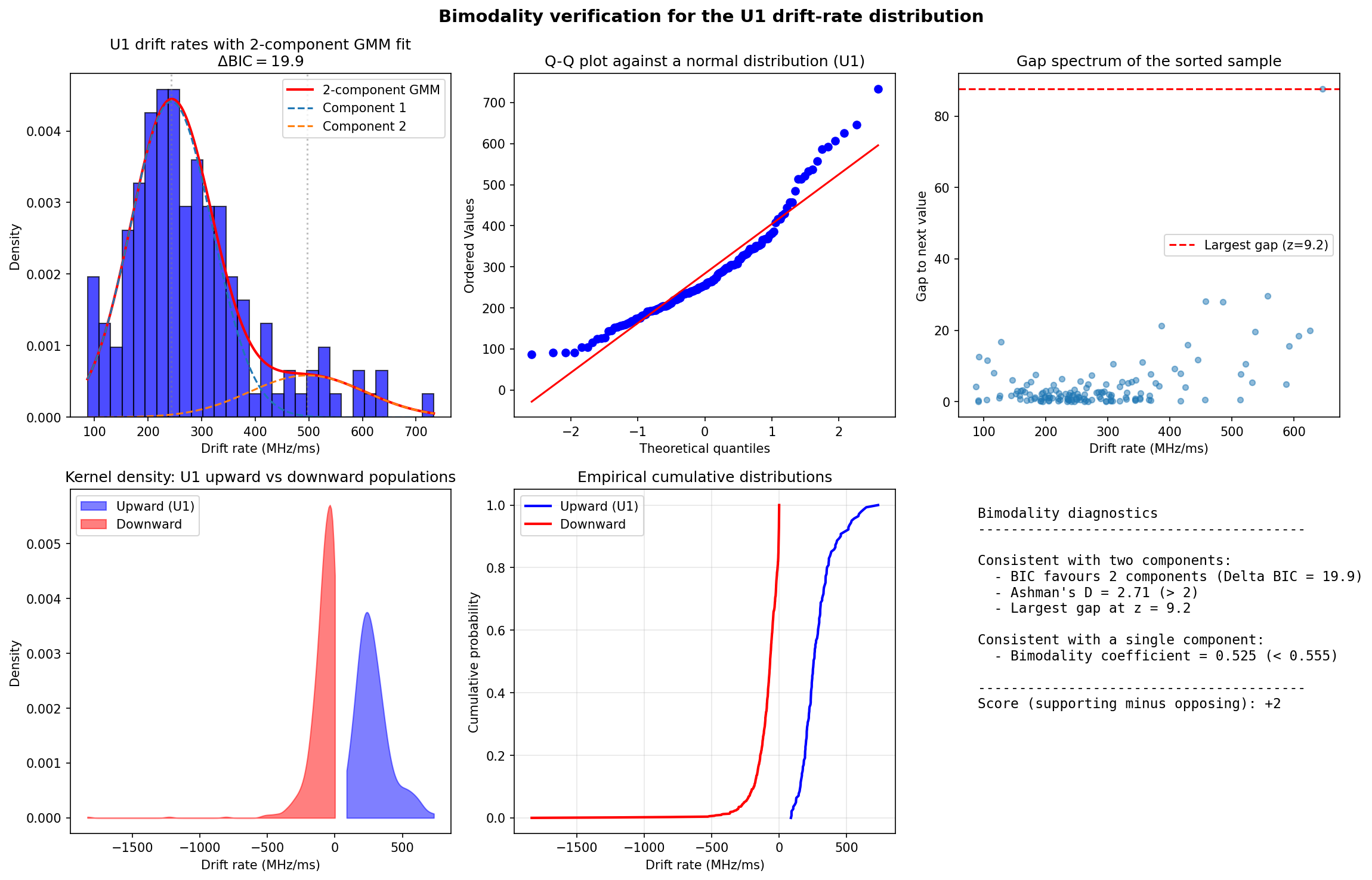 Bimodality analysis. Top left: histogram with two-component Gaussian mixture fit. Top right: Q-Q plot showing deviation from unimodal normal distribution. Bottom panels: gap analysis and comparison between upward- and downward-drifting populations.