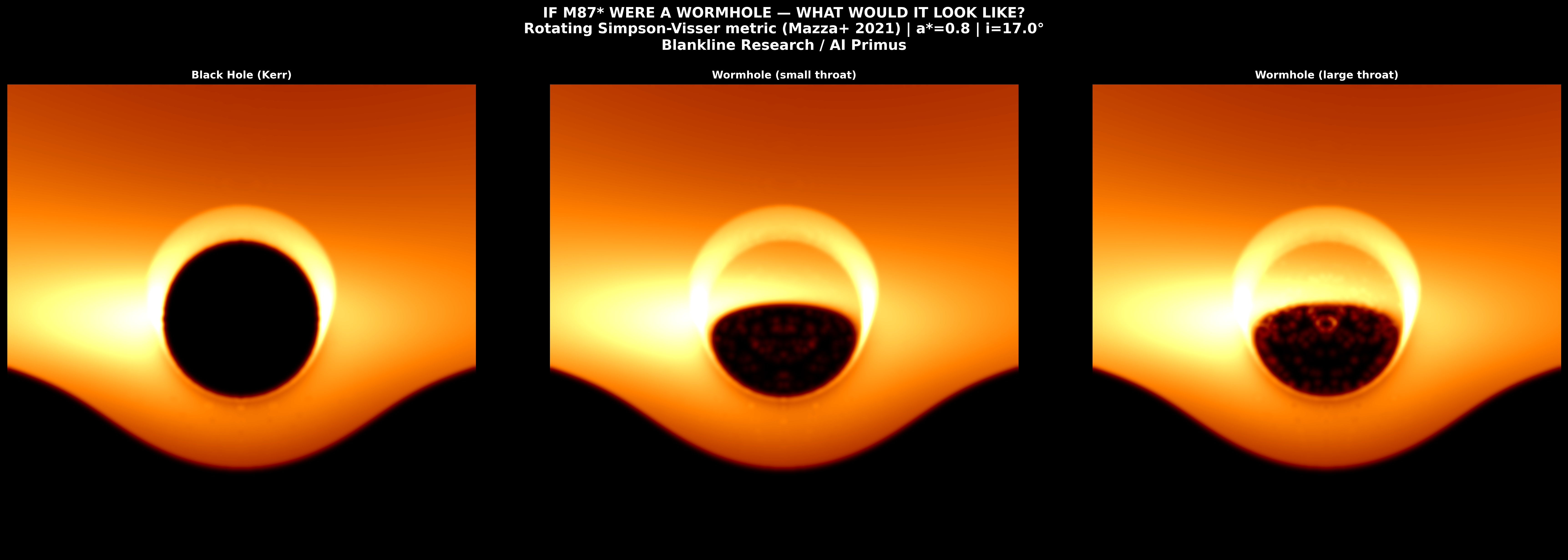 Left: M87 as a standard Kerr black hole — pure dark shadow. Center: M87* as a wormhole with a small throat — light begins leaking through. Right: M87* as a wormhole with a larger throat — the shadow fills with light from the other side of the universe.*