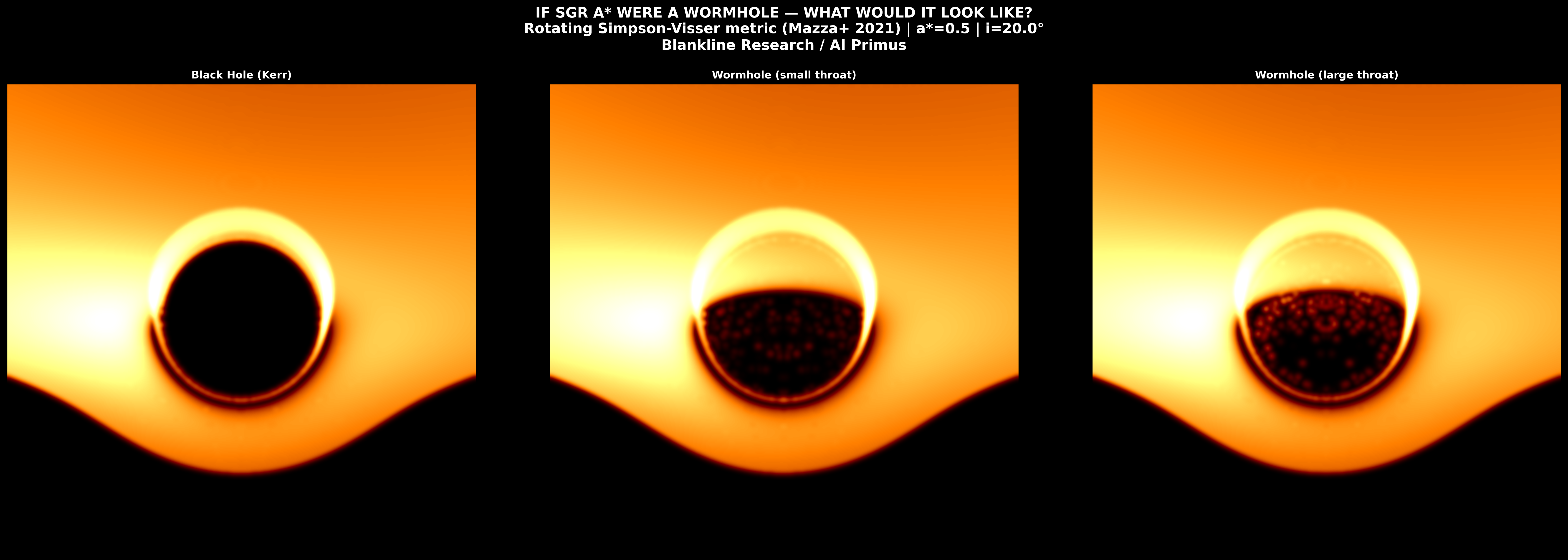 What we did: Built a general-relativistic ray tracer using the rotating Simpson-Visser metric (Mazza, Franzin, and Liberati, 2021). We traced photon geodesics through both black hole and wormhole spacetimes, using real EHT-measured parameters: